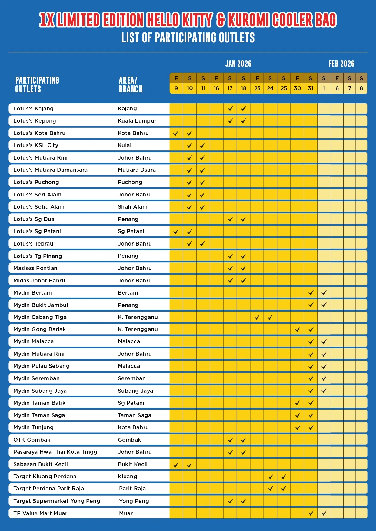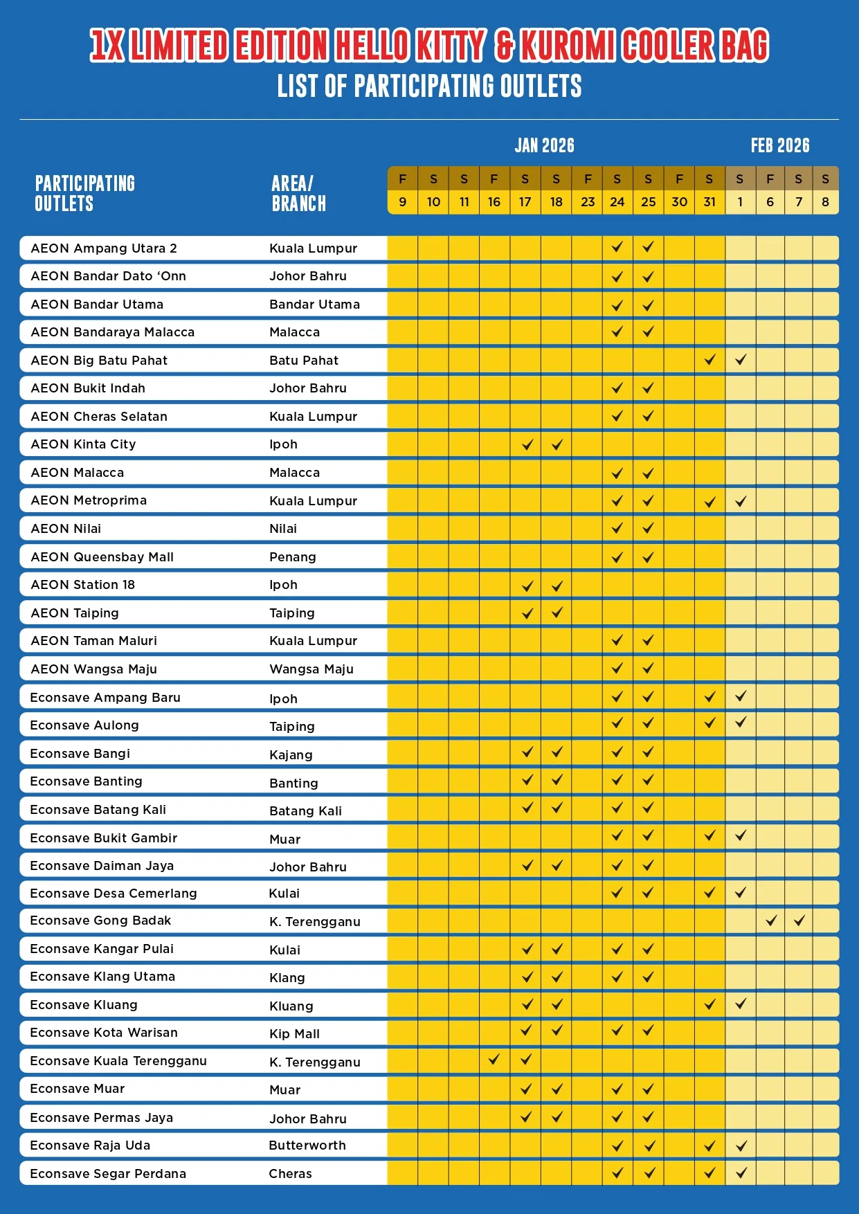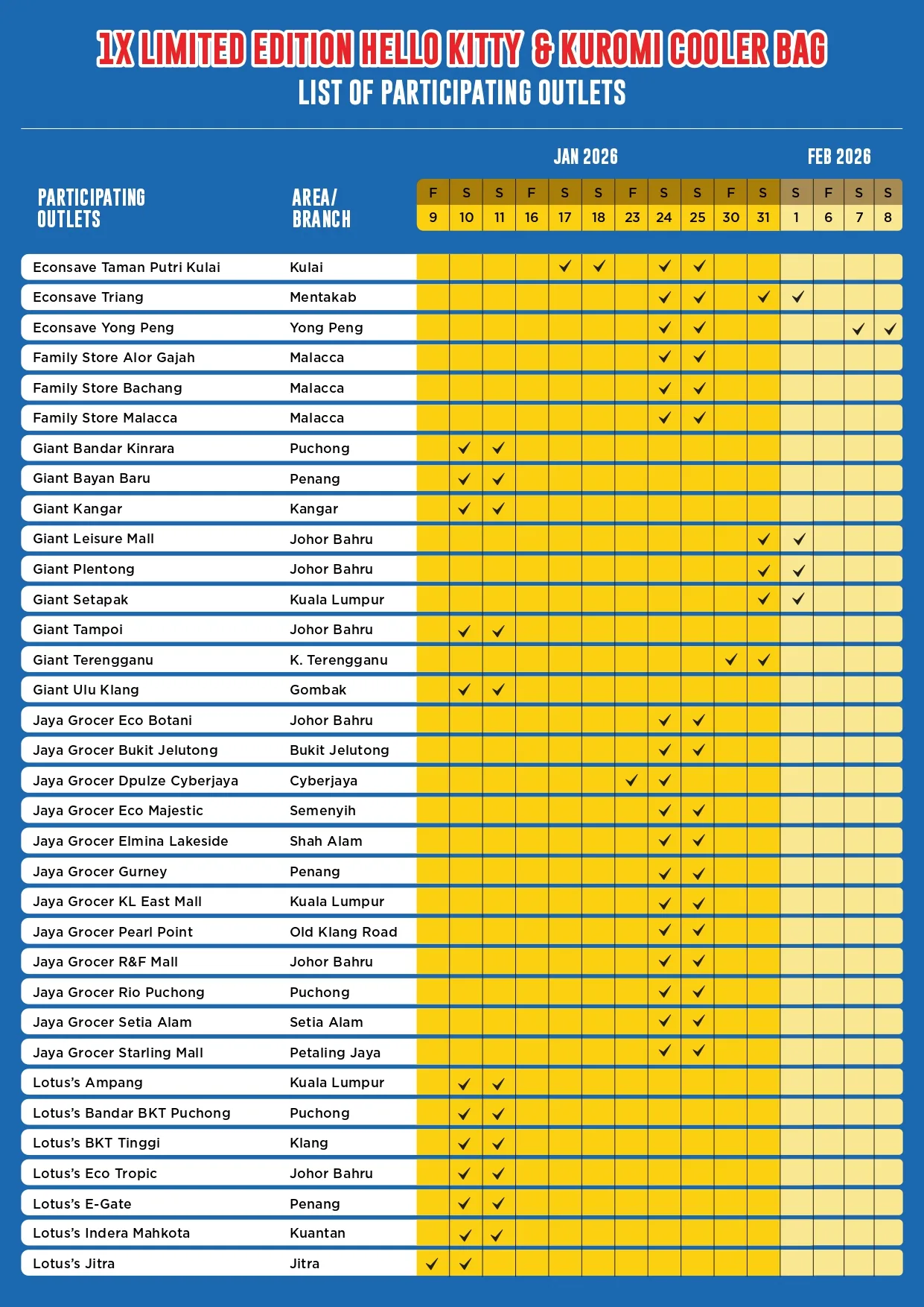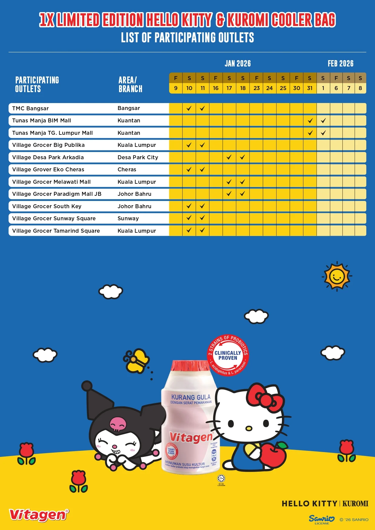 This Vitagen promotion is available at selected locations, offering shoppers a chance to receive a Free Limited Edition Hello Kitty & Kuromi Cooler Bag. Take a look at the participating outlets below to find out where this exclusive giveaway is happening.